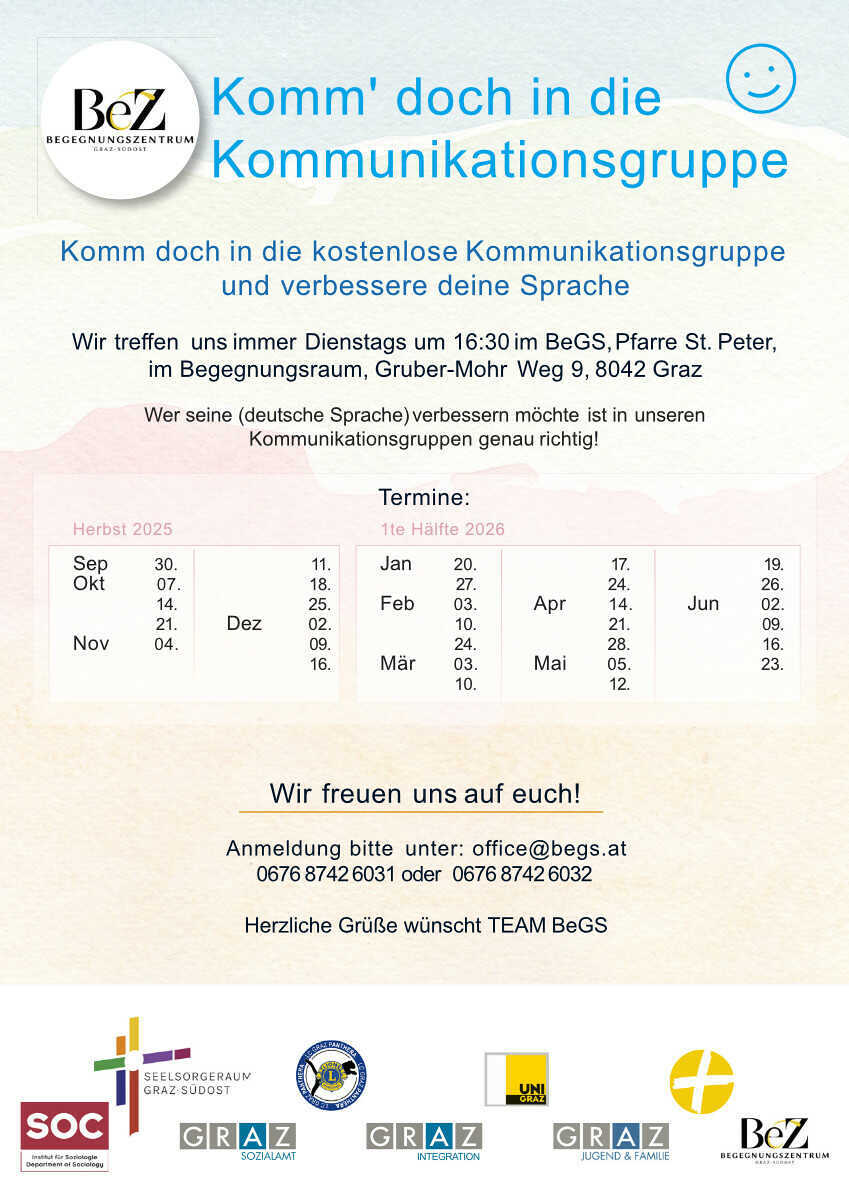 Ort: Pfarre St. Peter, Begegnungsraum, Gruber-Mohr Weg 9, 8042 Graz