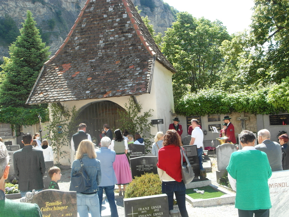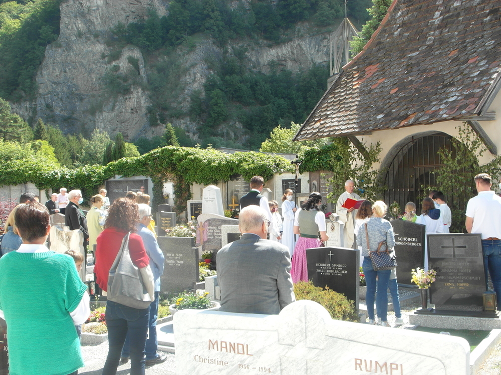 Der Zelebrant, Prof. Schlacher, erteilte nach der Festmesse den Segen für der Ort und seine Bewohner. Dieses erfolgte vor der renovierten, über 500 Jahre alten Friedhofs-Kapelle.