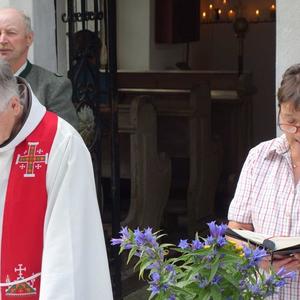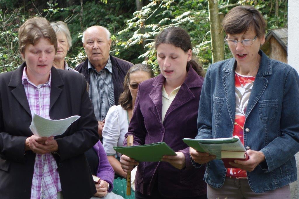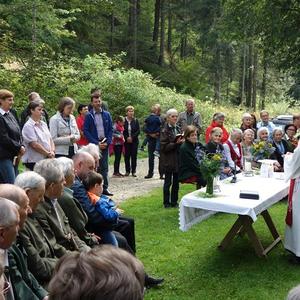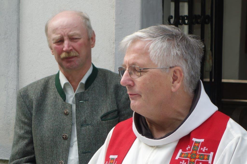 In Vertretung des Fußwallfahrers P. Simon zelebrierte Franziskaner-Guardian P. Josef Höller aus Graz in launiger Weise die Eucharistie, zu der rund 80 Gläubige bei herrlichem Wetter zu Fuß, mit den Fahrrädern oder per Auto gekommen sind.