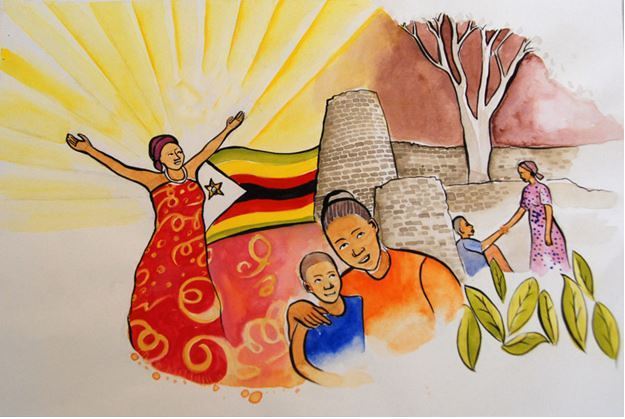 Das Titelbild zum Weltgebetstag aus Simbabwe wurde von der Künstlerin Nonhlanhla Mathe kreiert. Mathe malt seit 15 Jahren, hat bereits in der National Gallery of Zimbabwe ausgestellt und wurde als beste weibliche bildende Künstlerin mit dem ´Awards of Merit in Heritage Exhibition` ausgezeichnet. Das Bild zeichnet den Wandel innerhalb der simbabwischen Gesellschaft auf. Von der dunklen Vergangenheit im rechten oberen Eck bis hin zur Hoffnung und materiellem Wohlstand (symbolisiert durch Landwirtschaft und Vegetation) im Hier und Jetzt im restlichen Bild. Johannes 5: 2-9 inspiriert den unteren Bildteil – Liebe, Heilung, Versöhnung und die Freiheit zu einem selbstbestimmten Leben für Frauen ~ dargestellt in farbenfroher Lebendigkeit. Die Selbstbestimmung von und gegenseitige Unterstützung zwischen uns Frauen ist ein zentrales Element in Nonhlanhla Mathe`s Werk.