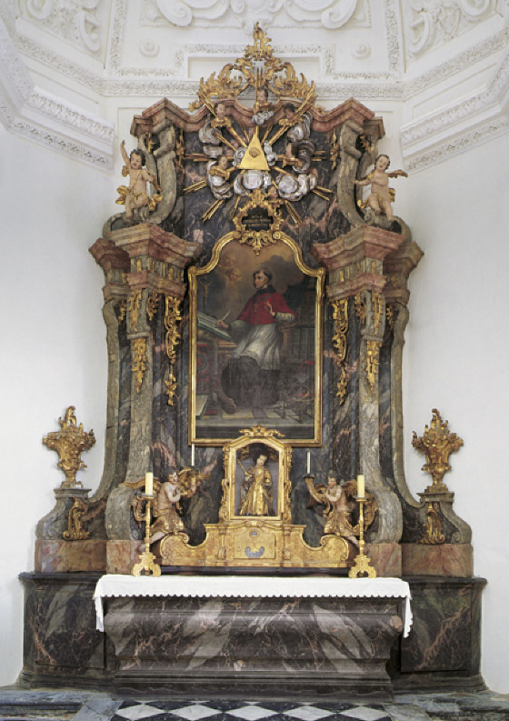 Der 1779 entstandene Altar ist dem Kirchenlehrer Kardinal Bonaventura, Generalminister des  Ordens der minderen  Brüder (*1221; †1274) geweiht. Auf dem auf 1778 datierten Altarblatt ist der Heilige als Kardinal und Schriftgelehrter in seiner Schreibstube dargestellt. Bonaventura verfasste 1260 ein Großes und ein Kleines Franziskusleben (Legenda maior und Legenda minor), die als offizielle Biographien alle zuvor entstandenen Lebensbeschreibungen des Heiligen Franziskus von Assisi ersetzten. Bonaventura wurde 1482 von Papst Sixtus IV. heiliggesprochen und 1588 von Sixtus V. zum Kirchenlehrer proklamiert. Das Gemälde trägt die Signatur von Philipp Carl Laubmann (*1730; †1792). Der viel beschäftigte Meister hinterließ zahlreiche Altarblätter in der ganzen Steiermark. Unter dem Altarbild ist in einem Schrein eine Nachbildung des Prager Jesulein ausgestellt, die im 3. Viertel des 18. Jahrhunderts entstanden sein dürfte. Das im Volk sehr verehrte Gnadenbild befindet sich in der Prager Karmelitenkirche Maria vom Sieg. Die im Original 47 cm hohe Wachsfigur wurde der Kirche 1628 von einer Fürstin Lobkowitz gestiftet.