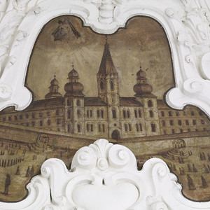 Die Wölbung in Form einer Tonne, in die über den Fenstern tiefe Stichkappen einschneiden, ist mit zartem weißen Stuck im Régence-Stil geschmückt. Er zeigt neben reicher Bandwerkornamentik Putten mit kirchlichen Insignien und Geräten. Der um 1739 entstandene Gewölbeschmuck wird Johann Cajetan Androy († 1755) zugeschrieben, der u. a. auch für das steirische Stift St. Lambrecht tätig war. Derselben Epoche entstammen die mit feinen Intarsienarbeiten geschmückten Sakristeischränke, die in die Jahre zwischen 1740 und 1750 datiert werden. Die beiden Schränke an der Südwand entstanden erst 1770.