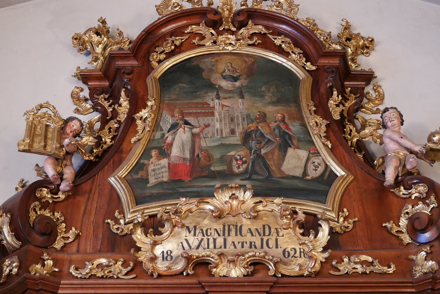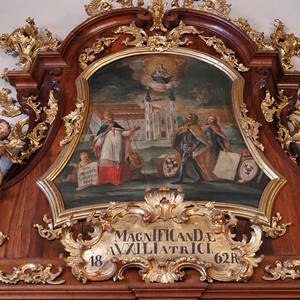Bemerkenswert ist auch die Gestaltung des inneren Portalrahmens. Er zeigt in der Supraporte ein Ölgemälde, das sich auf die Gewährung eines vollkommenen Ablasses durch Papst Klemens XII. im Jahre 1739 bezieht, der links im Vordergrund zu sehen ist. Am rechten Bildrand stehen die Kirchenstifter Erzherzog Ferdinand III., der spätere Kaiser Ferdinand II., und Hans Ulrich von Eggenberg mit dem Bauplan der Mariahilfkirche. Über der im Hintergrund dargestellten Klosteranlage schwebt das Gnadenbild. Das Chronogramm in der Kartusche unter dem Bild ergibt die Jahreszahl 1771.