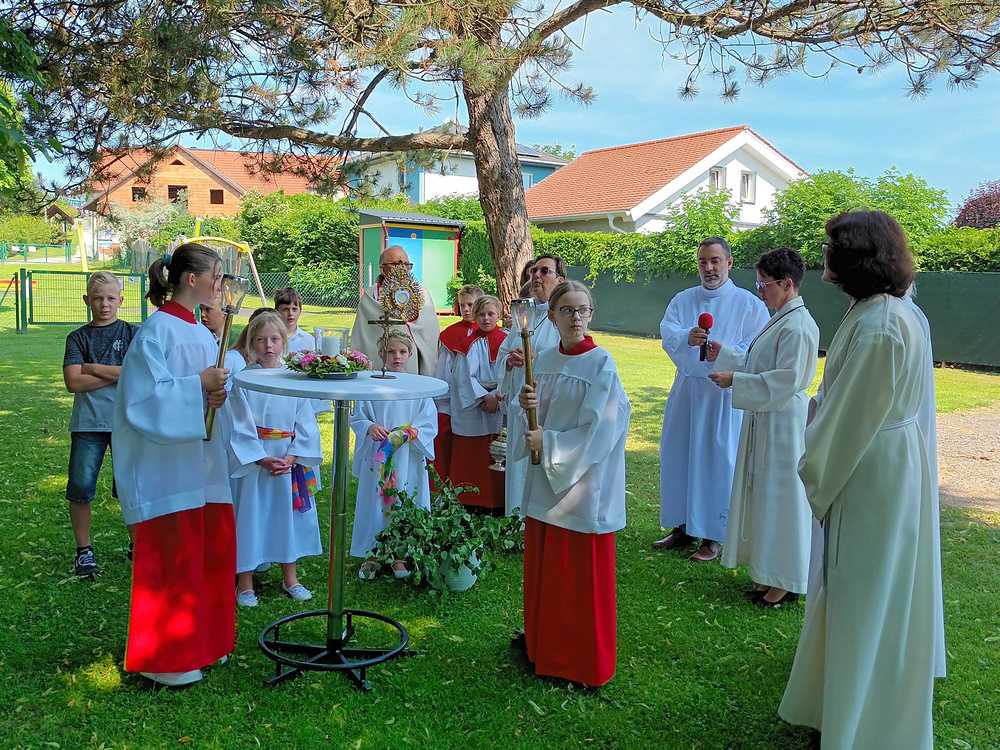 Zu Fronleichnam demonstrieren Katholikinnen und Katholiken ihren Glauben in der Öffentlichkeit. Sie demonstrieren dabei nicht gegen etwas sondern tretenfüretwas ein. Gemeinschaft und Zusammenarbeit zeigten die Pfarren Lieboch und Tobelbad in dieser schönen Feier. Neben den Kindern in ihren Erstkommuniongewändern, waren auch der Kameradschaftsbund und die Feuerwehr mit Abordnungen beider Pfarren vertreten. Vikar Norbert Glaser schloss mit dem eucharistischen Segen für die Kirche.