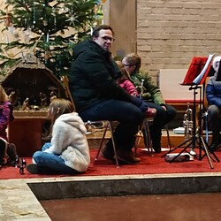 Weihnachtsmelodien der Bläsergruppe stimmten auf die Feier der Geburt Jesu in der Kirche ein. Vikar Gerhard Hatzmann erleuchtete mit seinen Worten und mit seinem persönlichen „Engel“ die Heilige Nacht. Der Kirchenchor und die Streicher beseelten die Feier mit feierlichen Klängen.