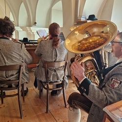 Musikalisch gestaltete eine Abordnung der MUZ von der Empore aus die heilige Messe - und auch danach beim Totengedenken mit Kranzniederlegung vor dem Kriegerdenkmal waren die Musiker*innen zur Stelle.