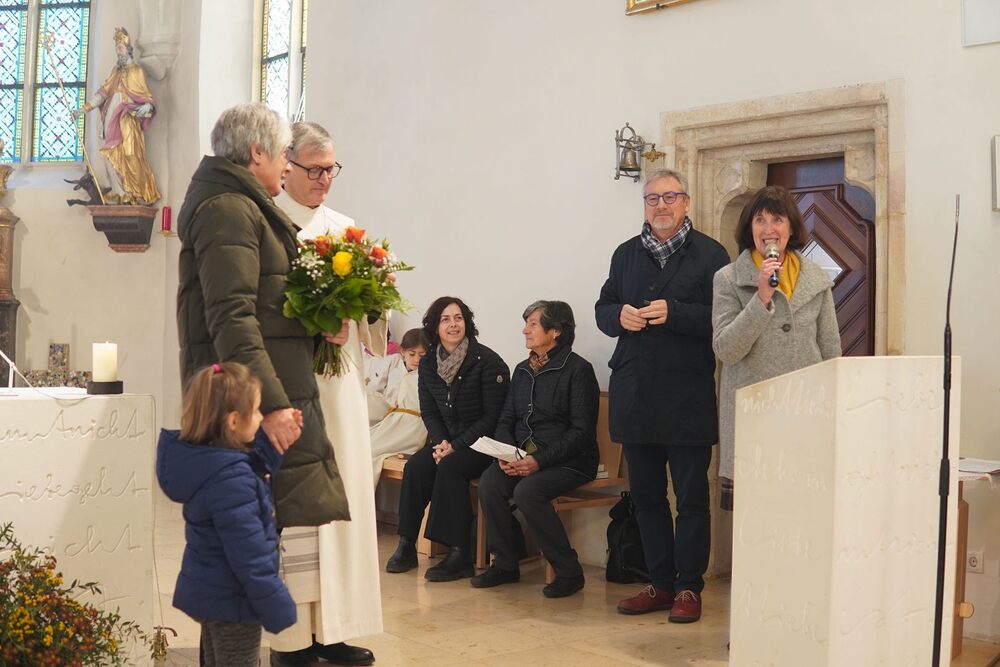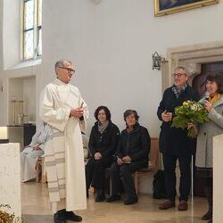 Vor dem Schlusssegen überreichte Ernst Pock im Namen der Pfarre dem neuen Diakon ein Aspergill, mit dem dieser gleich voll Freude die Gläubigen segnete. Für seine Ehefrau Eva, die ihm begleitend zur Seite steht, gab es einen Blumenstrauß, mit den besten Wünschen für sie.