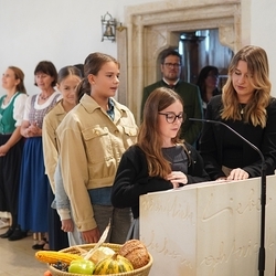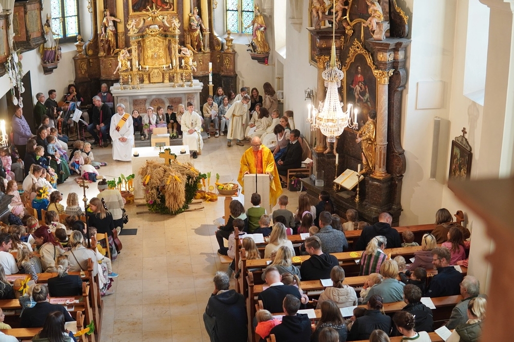 Nach dem feierlichen Einzug fand die Erntedankkrone, dieses liebevoll geschmückte Symbol reicher Ernte, vor dem Altar ihren Ehrenplatz. Danke der Landjugend Zettling für diese schöne Tradition!