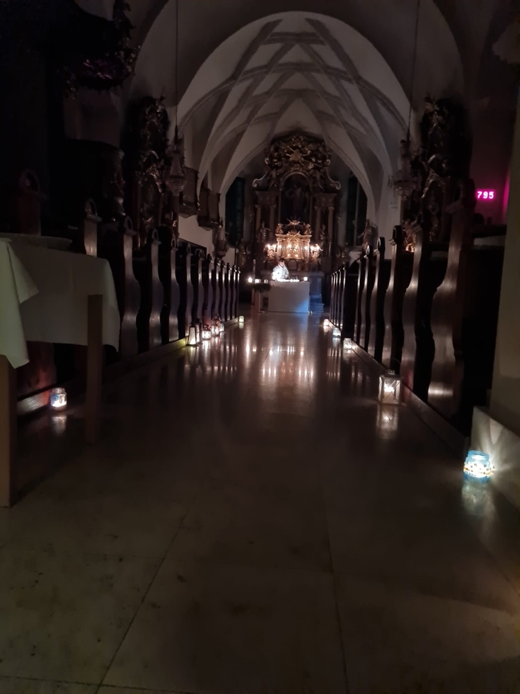 Vor dem Altar brannten 59 Teelichter für alle Menschen, die im letzten Jahr in unserer Pfarre verstorben sind. Ihre Namen wurden noch einmal laut ausgesprochen. Ein Teelicht leuchtete für alle Verstorbenen, die ungenannt blieben.