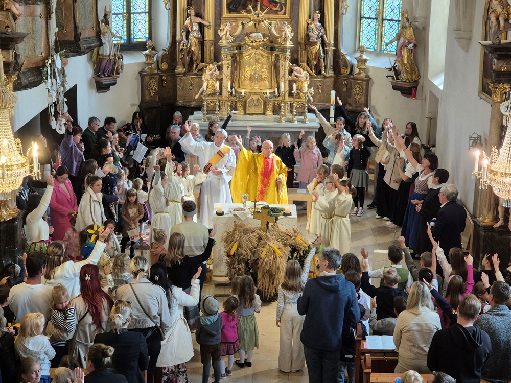 Von der schwungvollen Musik unserer Musikgruppe begeistert, sangen wirklich alle gerne mit, vom Kirchenchor bis zu den VS-Kindern, deren besonderer Erntedankschmuck übrigens nun die Empore im Altarraum ziert.