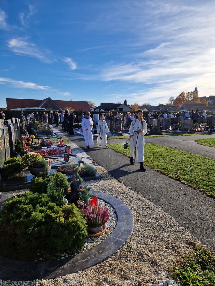 Zum Abschluss boten die bei der Feier fleißig assistierenden Minis an den Friedhof-Ausgängen gegen freiwillige Spende ihre am Vortag gebackenen Allerheiligenstriezerl an, die im Nu ausverkauft waren!
