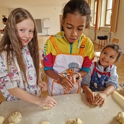 Dank Elena im Kindergarten Premstätten hatten sie neben dem Herd im Pfarrhof auch noch zwei weitere Herde in Verwendung, um die große Menge an geformten Teiglingen zu Köstlichkeiten zu verwandeln.